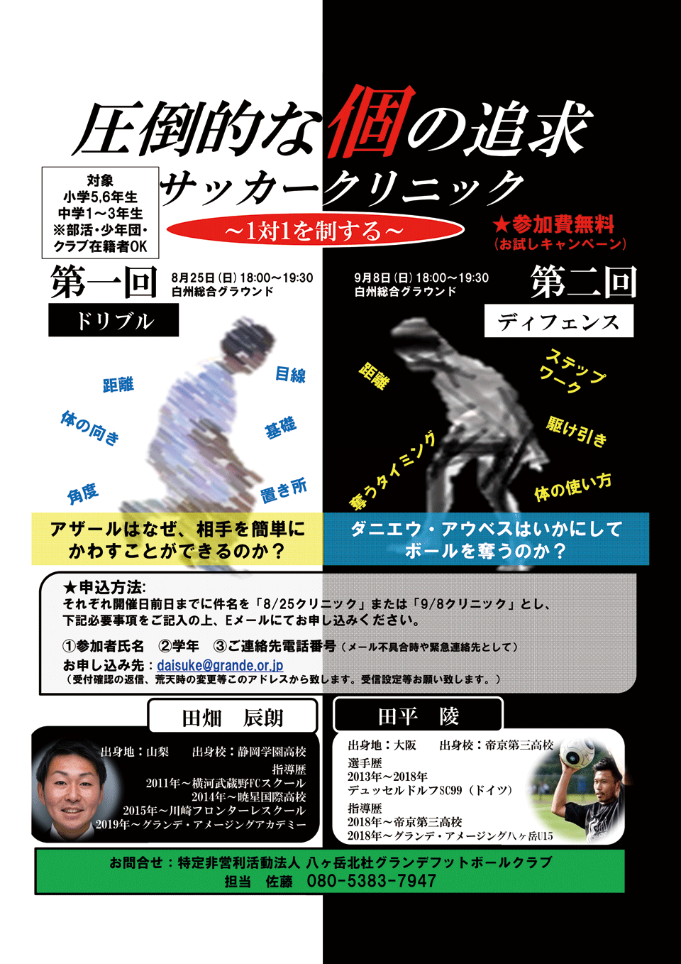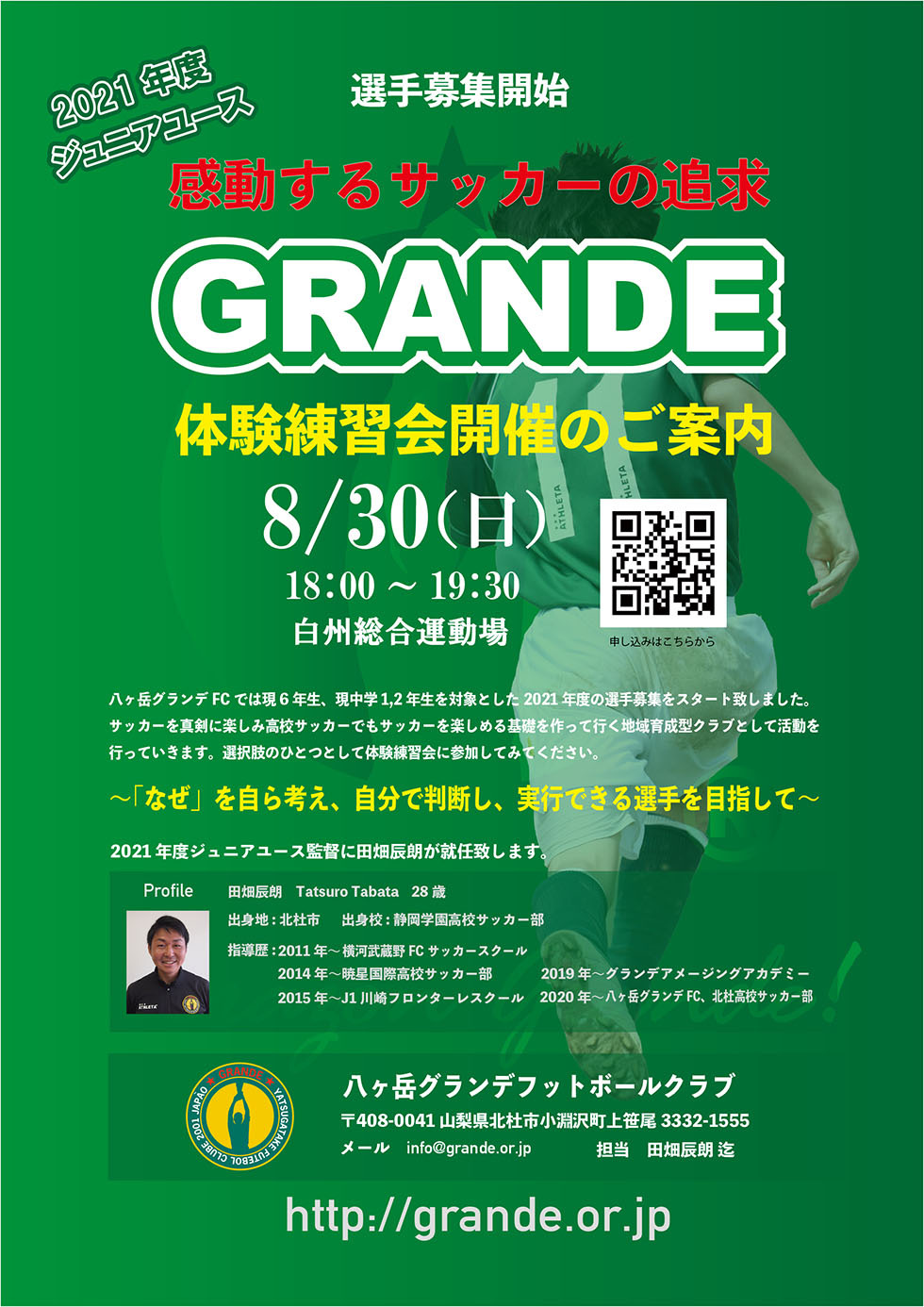 問い合わせ先→ジュニアユース監督田畑辰朗 tabatatsu@grande.or.jp まで御願いします。