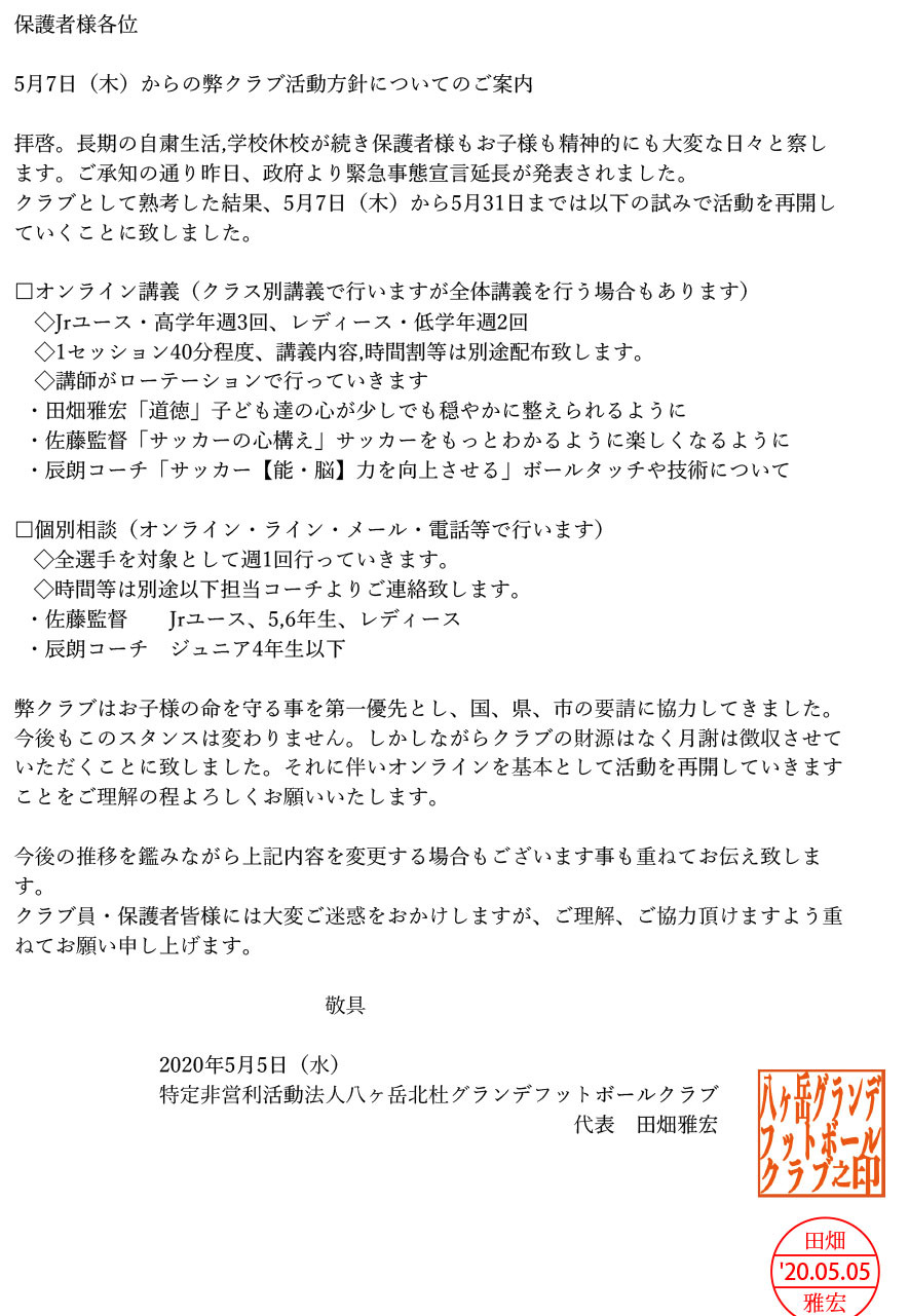 クラブ員・保護者皆様には大変ご迷惑をおかけしますが、ご理解、ご協力頂けますようお願い申し上げます。