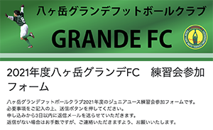 問い合わせ先→ジュニアユース監督田畑辰朗 tabatatsu@grande.or.jp まで御願いします。体験練習参加申し込みはこちらからお願いします。