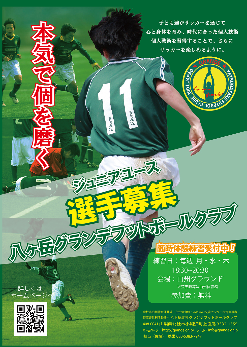 問い合わせ先→ジュニアユース監督田畑辰朗 tabatatsu@grande.or.jp まで御願いします。